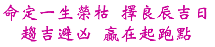 既然命定一生榮枯可見出生八字對人一生之影響根據本人三十年經驗,擇日生產,首重八字格局,及在詳盡後天運勢之轉折。當然,要命好且運又順,其一生之格局時難逢之,擇日生產須在其間取平衝點,尤其生男生女在擇日上更有不同變化之意,當然命中之神,煞更是關鍵之所在,如文昌、貴人、祿神…等吉星,絕不可缺,兇神則宜避之。